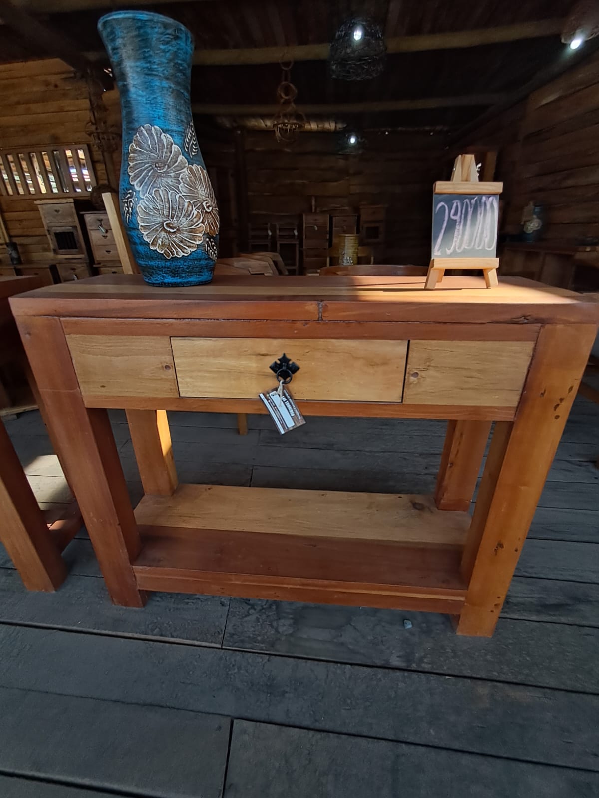 Este elegante arrimo de estilo rústico está fabricado en madera natural de tonos cálidos que realzan la belleza y autenticidad del material. Cuenta con un cajón central ideal para guardar objetos pequeños y una repisa inferior perfecta para decoración o almacenamiento adicional. Su diseño robusto y funcional lo convierte en una pieza versátil, ideal para entradas, pasillos o livings. ¡Aporta calidez y estilo a tu hogar con este arrimo único!