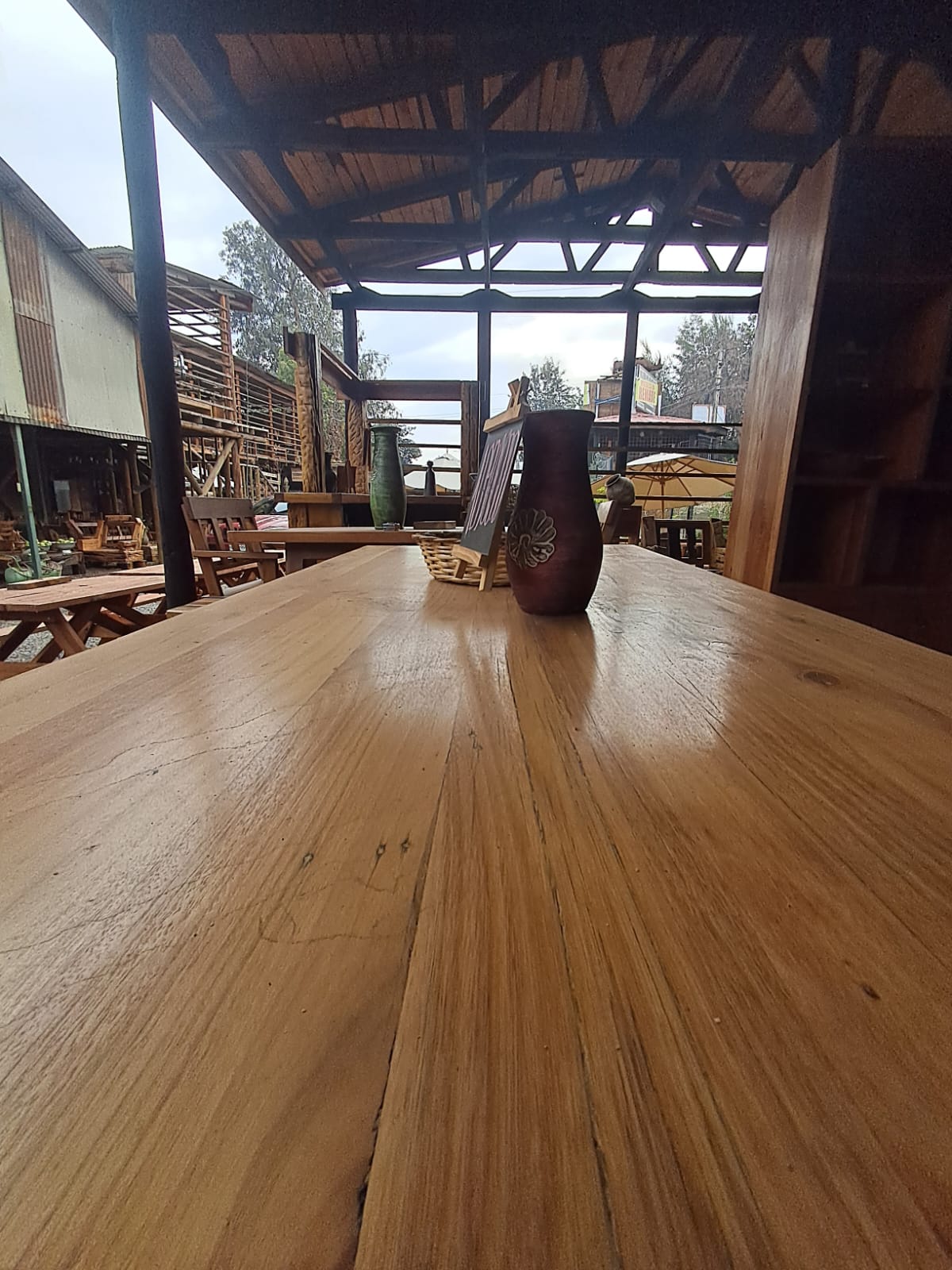 Este comedor de líneas simples y textura natural combina elegancia y funcionalidad. Conformado por una mesa de diseño tradicional y dos bancas amplias, destaca por su coloración contrastada y acabados aceitados que realzan la veta. Perfecto para terrazas, comedores familiares o restaurantes temáticos.