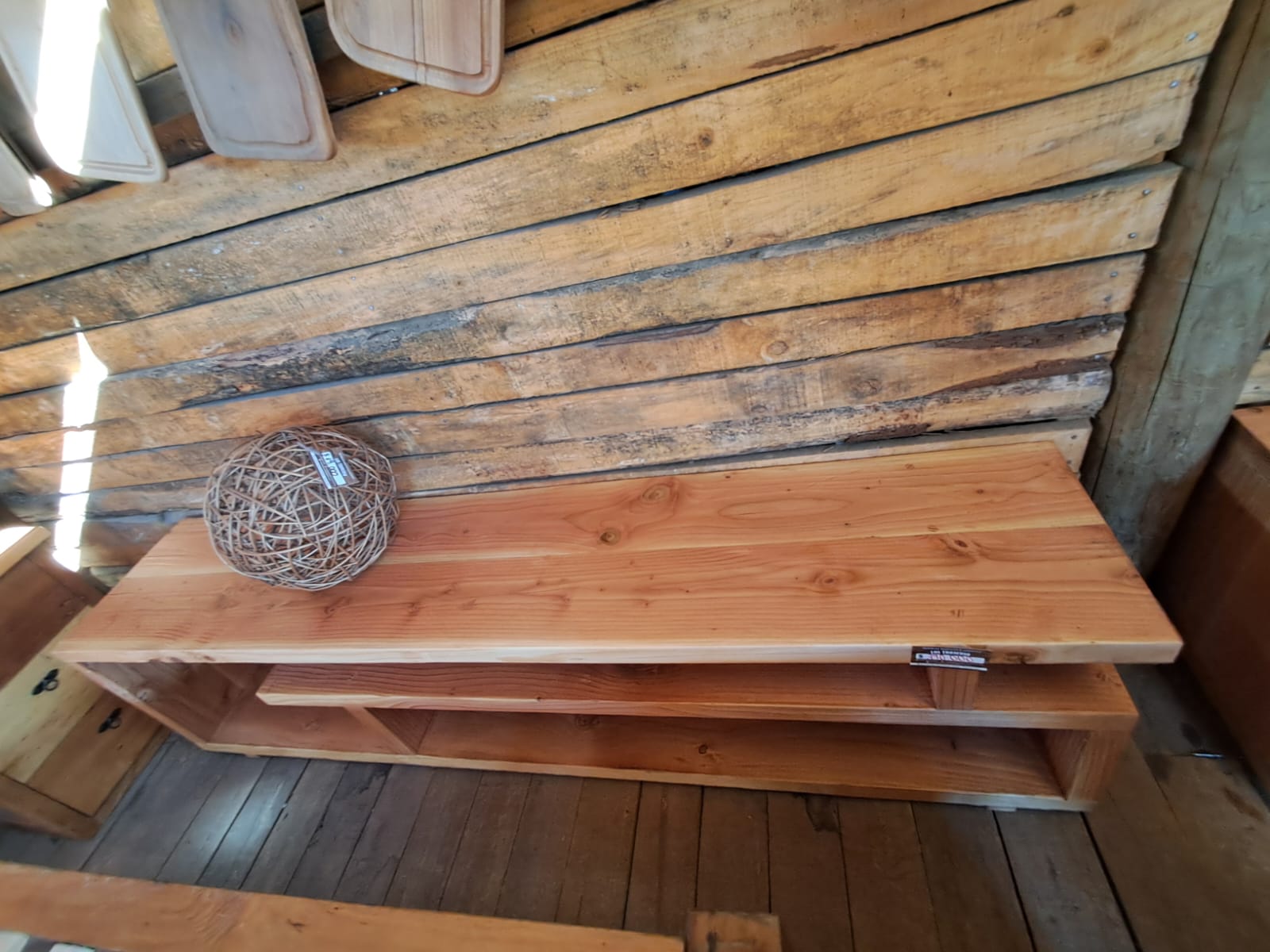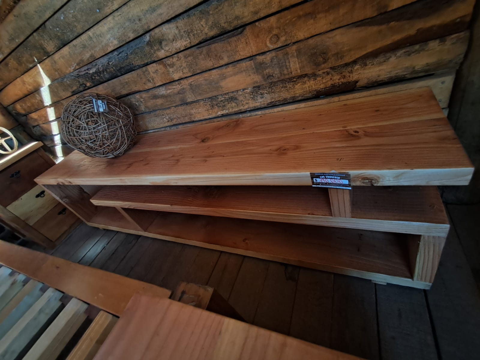 Sencillo, robusto y con alma campestre. Este mueble bajo de madera es perfecto como rack para televisión o consola decorativa. Su estante central permite organizar libros, adornos o dispositivos, todo con la calidez del acabado natural y vetas visibles que dan vida a cada rincón.