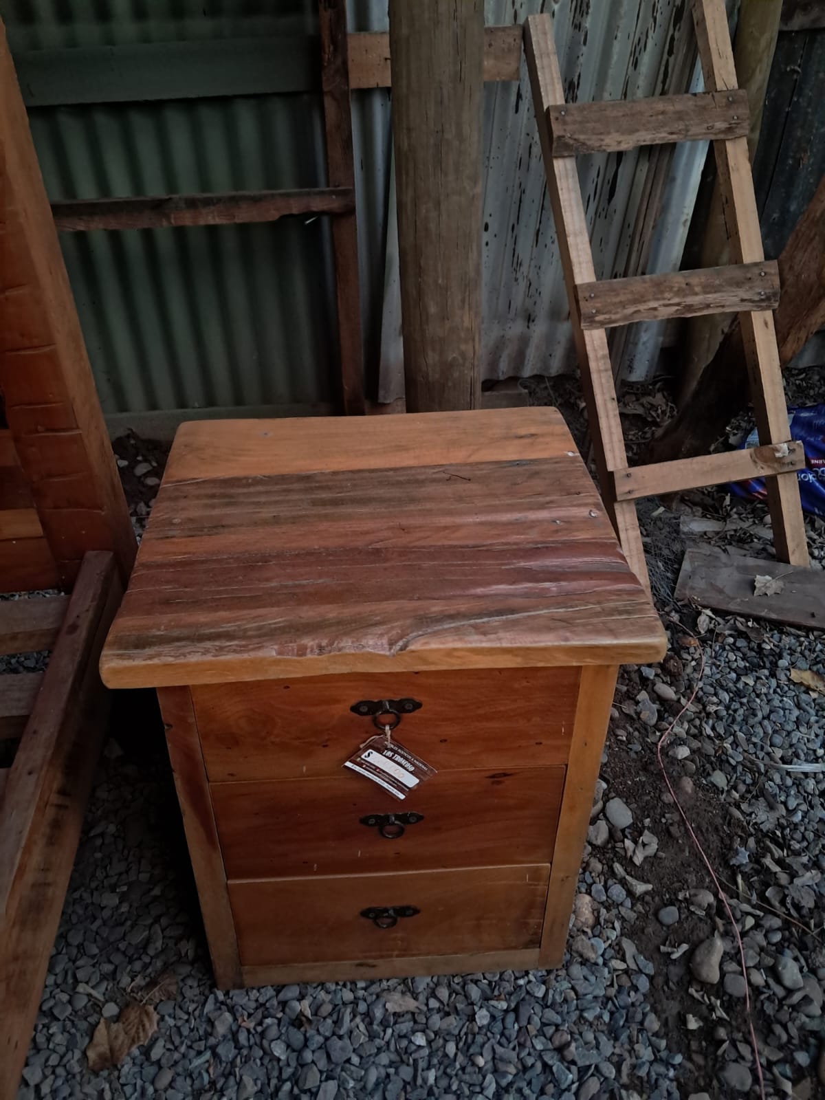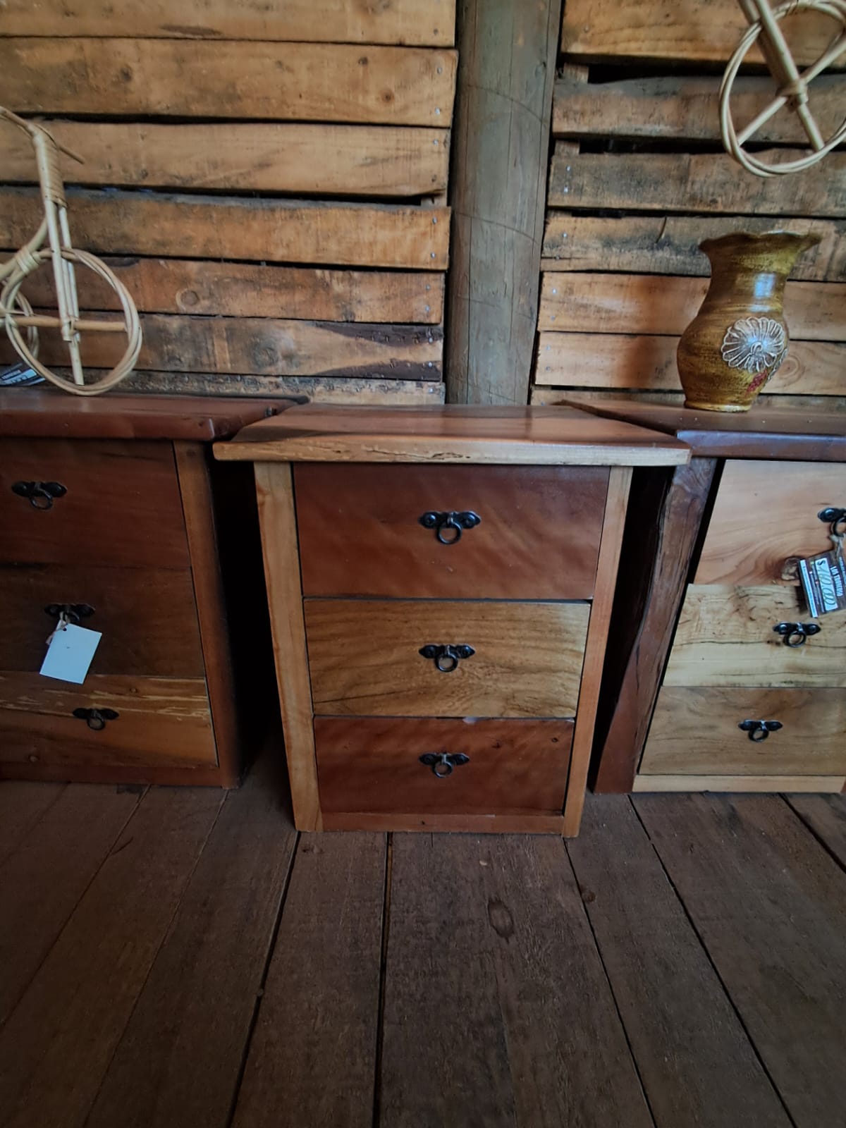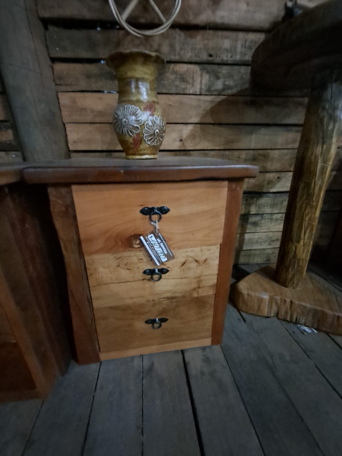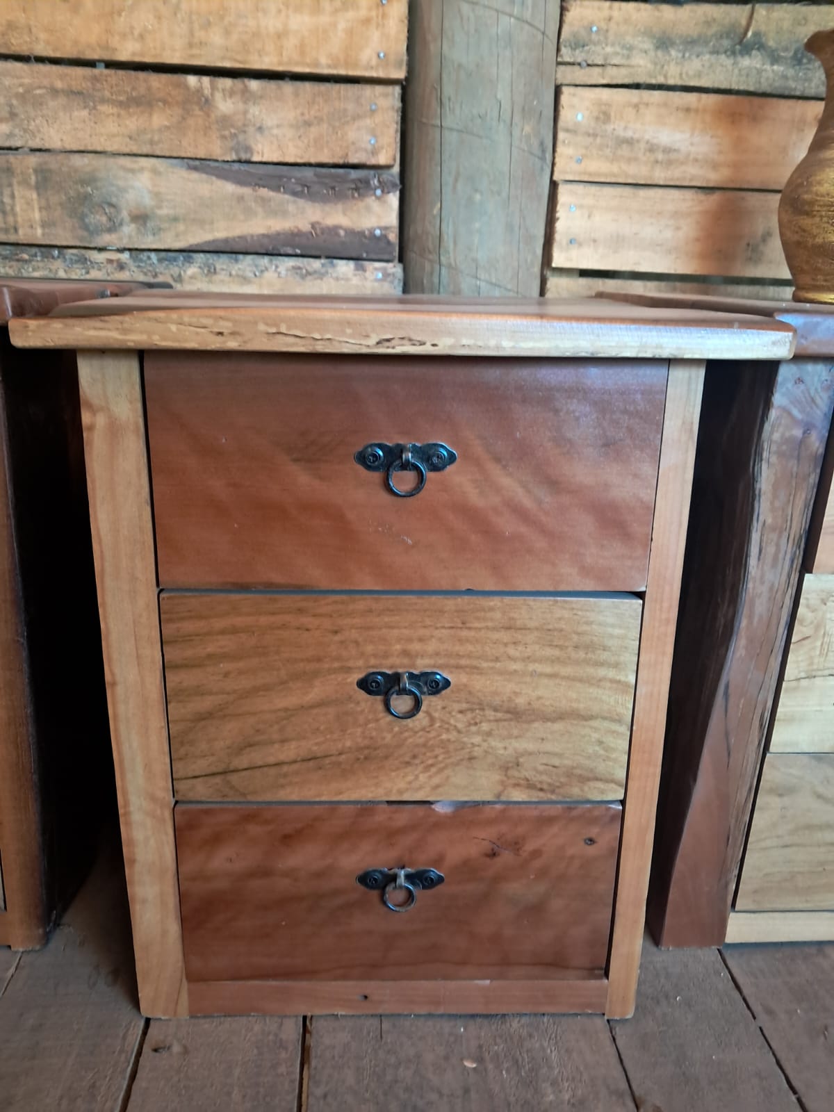 Con bordes irregulares que simulan el corte natural del árbol, estos veladores aporta autenticidad y encanto. Con tres cajones funcionales y herrajes rústicos, es ideal para dormitorios que buscan personalidad en cada rincón.